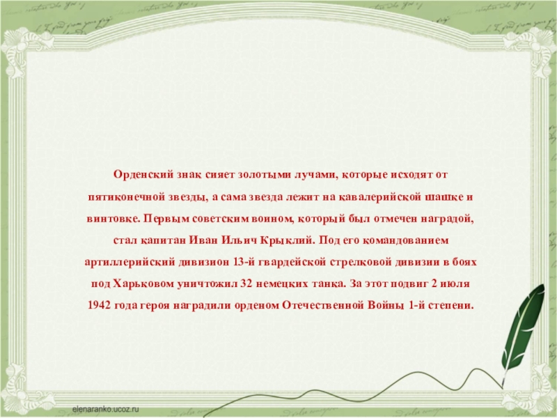 советским воином, который был отмечен наградой, стал капитан Иван Ильич Крыклий. Под его командованием артиллерийский дивизион 13-й гвардейской стрелковой дивизии в боях под Харьковом уничтожил 32 немецких танка. За этот подвиг 2 июля 1942 года героя наградили орденом Отечественной Войны 1-й степени.