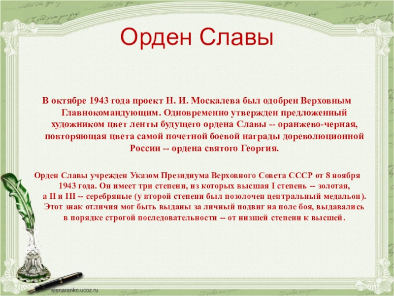 Орден Славы учрежден Указом Президиума Верховного Совета СССР от 8 ноября 1943 года. Он имеет три степени, из которых высшая I степень -- золотая, а II и III -- серебряные (у второй степени был позолочен центральный медальон). Этот знак отличия мог быть выданы за личный подвиг на поле боя, выдавались в порядке строгой последовательности -- от низшей степени к высшей.
