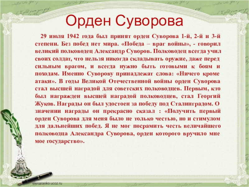 мира. «Победа – враг войны», - говорил великий полководец Александр Суворов. Полководец всегда учил своих солдат, что нельзя никогда складывать оружие, даже перед сильным врагом, и всегда нужно быть готовыми к боям и походам. Именно Суворову принадлежат слова: «Ничего кроме атаки». В годы Великой Отечественной войны орден Суворова стал высшей наградой для советских полководцев. Первым, кто был награжден высшей наградой полководцев, стал Георгий Жуков. Награды он был удостоен за победу под Сталинградом. О значении награды он прекрасно сказал : «Получить первый орден Суворова для меня было не только честью, но и стимулом для дальнейших побед. Я не мог посрамить честь величайшего полководца Александра Суворова, орден которого вручило мне мое государство».