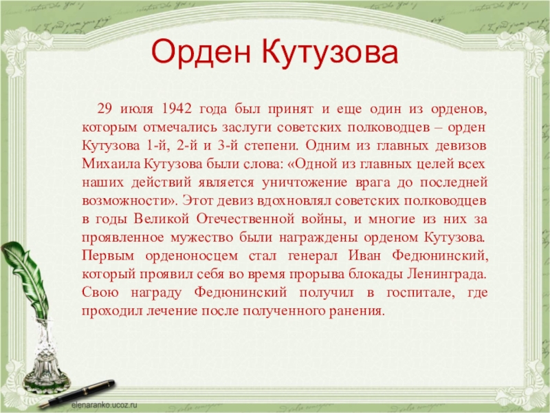 полководцев – орден Кутузова 1-й, 2-й и 3-й степени. Одним из главных девизов Михаила Кутузова были слова: «Одной из главных целей всех наших действий является уничтожение врага до последней возможности». Этот девиз вдохновлял советских полководцев в годы Великой Отечественной войны, и многие из них за проявленное мужество были награждены орденом Кутузова. Первым орденоносцем стал генерал Иван Федюнинский, который проявил себя во время прорыва блокады Ленинграда. Свою награду Федюнинский получил в госпитале, где проходил лечение после полученного ранения.