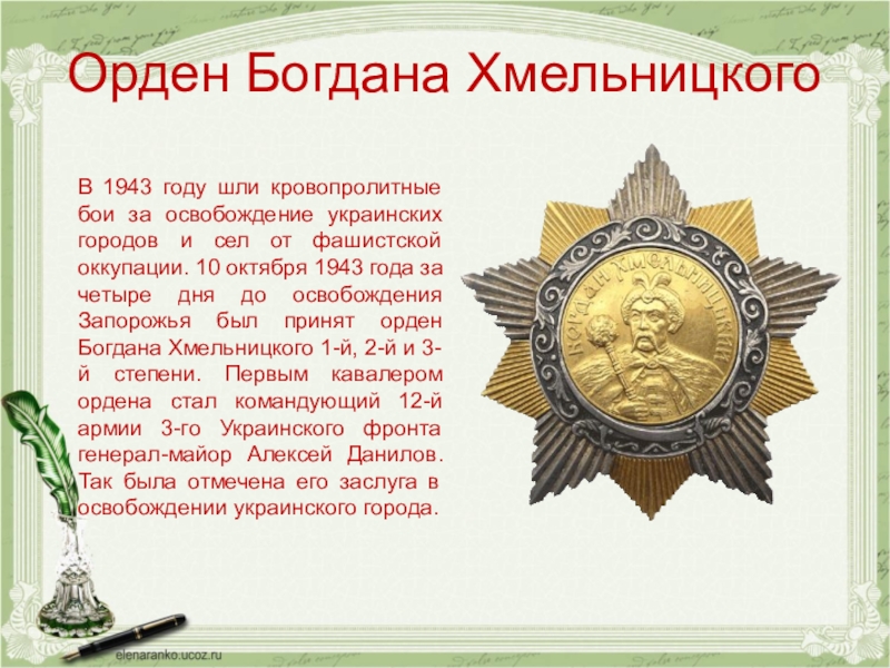 года за четыре дня до освобождения Запорожья был принят орден Богдана Хмельницкого 1-й, 2-й и 3-й степени. Первым кавалером ордена стал командующий 12-й армии 3-го Украинского фронта генерал-майор Алексей Данилов. Так была отмечена его заслуга в освобождении украинского города.