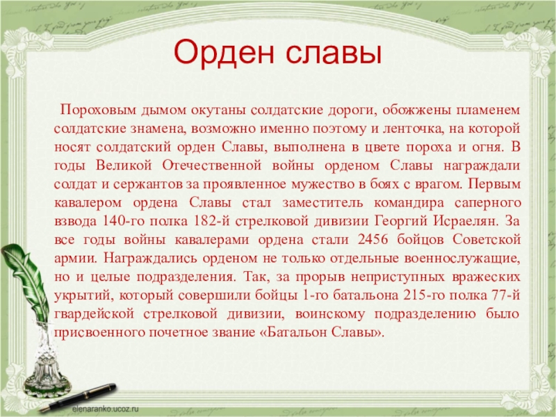 которой носят солдатский орден Славы, выполнена в цвете пороха и огня. В годы Великой Отечественной войны орденом Славы награждали солдат и сержантов за проявленное мужество в боях с врагом. Первым кавалером ордена Славы стал заместитель командира саперного взвода 140-го полка 182-й стрелковой дивизии Георгий Исраелян. За все годы войны кавалерами ордена стали 2456 бойцов Советской армии. Награждались орденом не только отдельные военнослужащие, но и целые подразделения. Так, за прорыв неприступных вражеских укрытий, который совершили бойцы 1-го батальона 215-го полка 77-й гвардейской стрелковой дивизии, воинскому подразделению было присвоенного почетное звание «Батальон Славы».