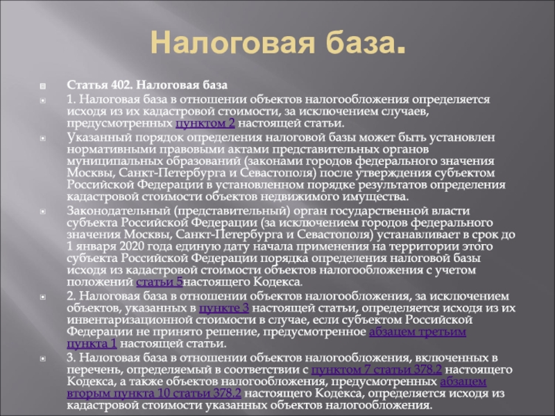 Законодательный (представительный) орган государственной власти субъекта Российской Федерации (за исключением городов федерального значения Москвы, Санкт-Петербурга и Севастополя) устанавливает в срок до 1 января 2020 года единую дату начала применения на территории этого субъекта Российской Федерации порядка определения налоговой базы исходя из кадастровой стоимости объектов налогообложения с учетом положений статьи 5настоящего Кодекса.