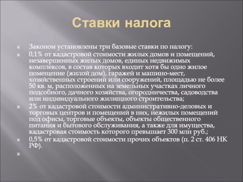 2% от кадастровой стоимости административно-деловых и торговых центров и помещений в них, нежилых помещений под офисы, торговые объекты, объекты общественного питания и бытового обслуживания, а также для имущества, кадастровая стоимость которого превышает 300 млн руб.;