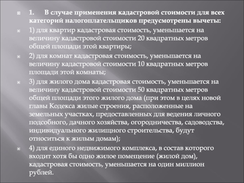 3) для жилого дома кадастровая стоимость, уменьшается на величину кадастровой стоимости 50 квадратных метров общей площади этого жилого дома (при этом в целях новой главы Кодекса жилые строения, расположенные на земельных участках, предоставленных для ведения личного подсобного, дачного хозяйства, огородничества, садоводства, индивидуального жилищного строительства, будут относиться к жилым домам);