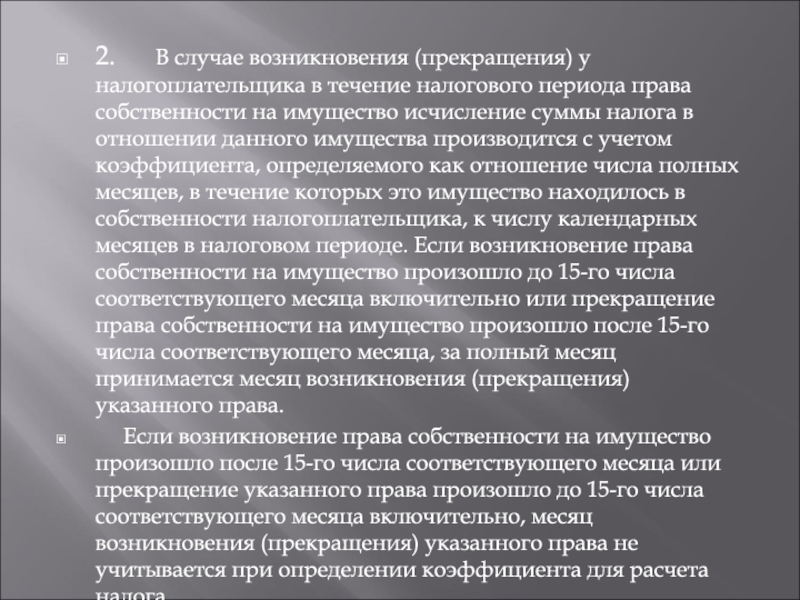 Если возникновение права собственности на имущество произошло после 15-го числа соответствующего месяца или прекращение указанного права произошло до 15-го числа соответствующего месяца включительно, месяц возникновения (прекращения) указанного права не учитывается при определении коэффициента для расчета налога.