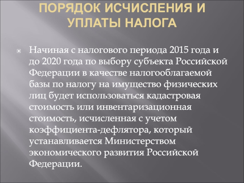 Начиная с 2016 года налог на имущество физических лиц будет рассчитываться (за налоговый период 2015 год и далее) по новым правилам в соответствии с главой 32 «Налог на имущество физических лиц» Налогового кодекса РФ.