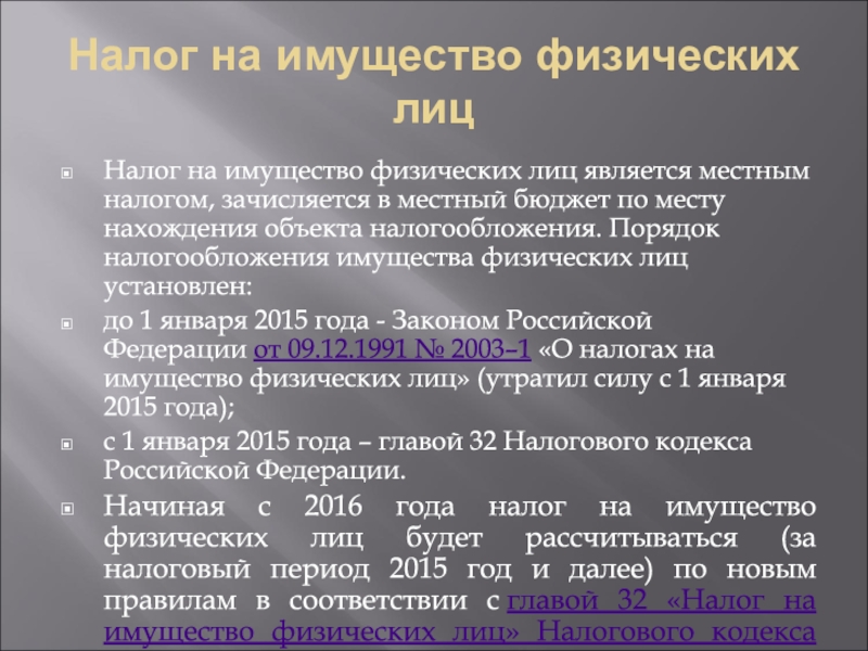 до 1 января 2015 года - Законом Российской Федерации от 09.12.1991 № 2003–1 «О налогах на имущество физических лиц» (утратил силу с 1 января 2015 года);