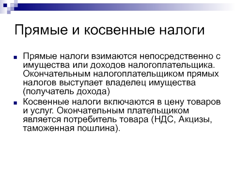 доходов налогоплательщика. Окончательным налогоплательщиком прямых налогов выступает владелец имущества(получатель дохода)