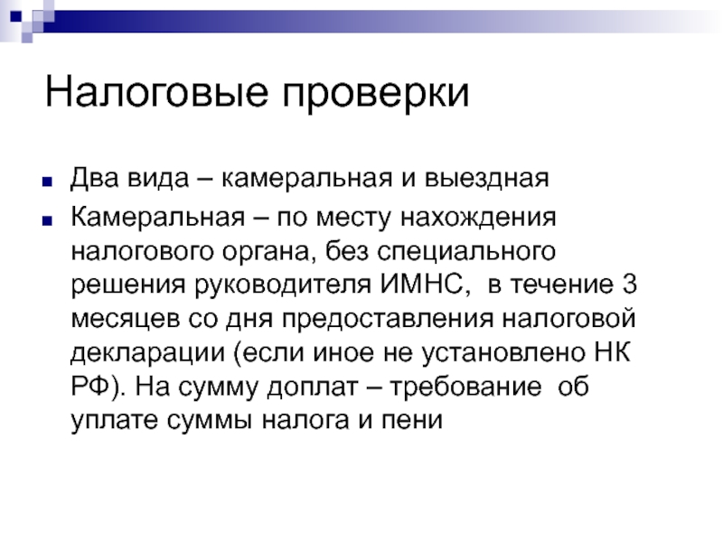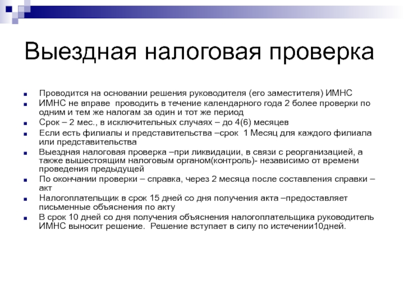 Выездная налоговая проверка –при ликвидации, в связи с реорганизацией, а также вышестоящим налоговым органом(контроль)- независимо от времени проведения предыдущей