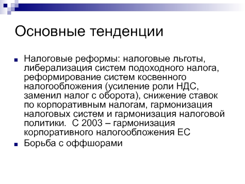 снижение ставок по корпоративным налогам, гармонизация налоговых систем и гармонизация налоговой политики. С 2003 – гармонизация корпоративного налогообложения ЕС