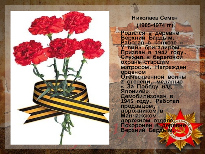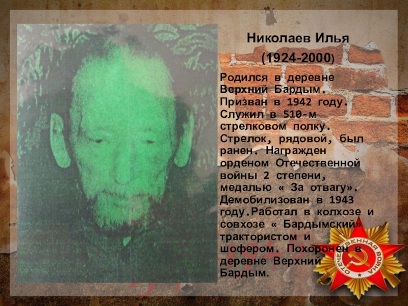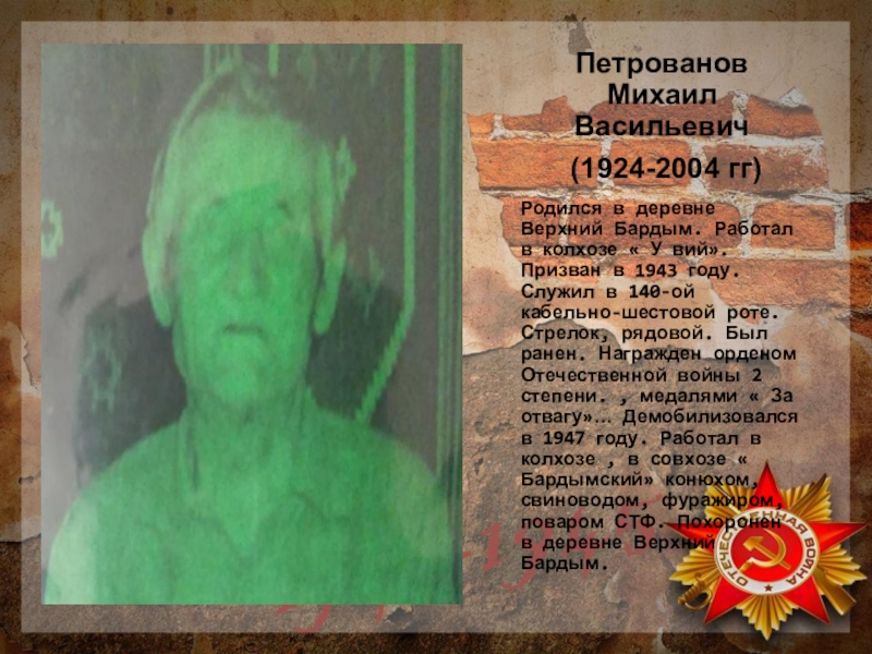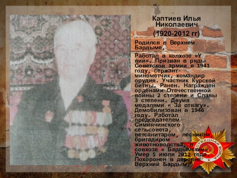 частях. Зам командира взвода. Награжден орденом Отечественной войны 2 степени, медалями… Демобилизован в 1950 году. Работал в колхозе плотником, кладовщиком зерносклада. Похоронен в деревне Верхний Бардым