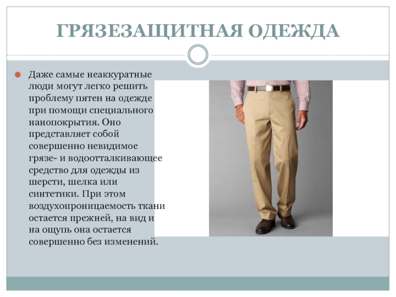ГРЯЗЕЗАЩИТНАЯ ОДЕЖДАДаже самые неаккуратные люди могут легко решить проблему пятен на одежде при помощи специального нанопокрытия. Оно