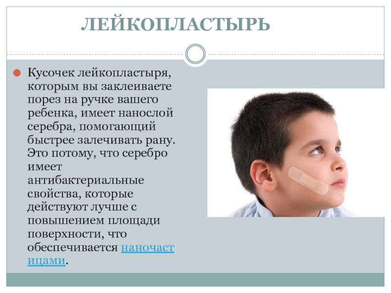 ЛЕЙКОПЛАСТЫРЬКусочек лейкопластыря, которым вы заклеиваете порез на ручке вашего ребенка, имеет нанослой серебра, помогающий быстрее залечивать рану. Это потому, что серебро имеет антибактериальные свойства, которые действуют лучше с повышением площади поверхности,