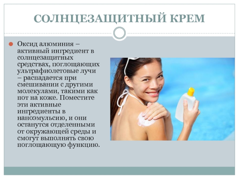 СОЛНЦЕЗАЩИТНЫЙ КРЕМОксид алюминия – активный ингредиент в солнцезащитных средствах, поглощающих ультрафиолетовые лучи – распадается при смешивании с