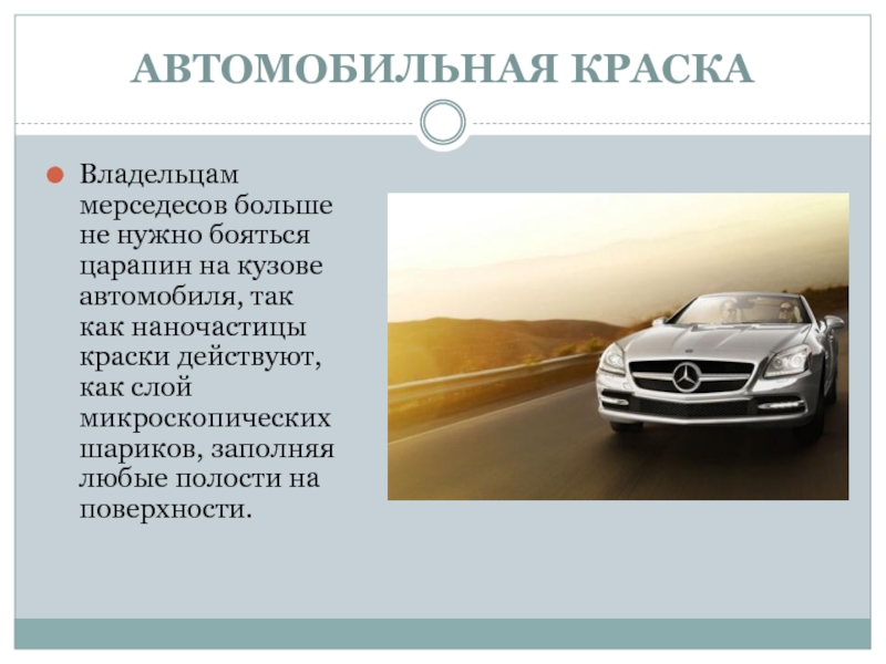 АВТОМОБИЛЬНАЯ КРАСКАВладельцам мерседесов больше не нужно бояться царапин на кузове автомобиля, так как наночастицы краски действуют, как