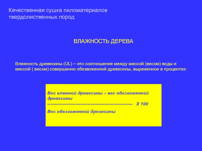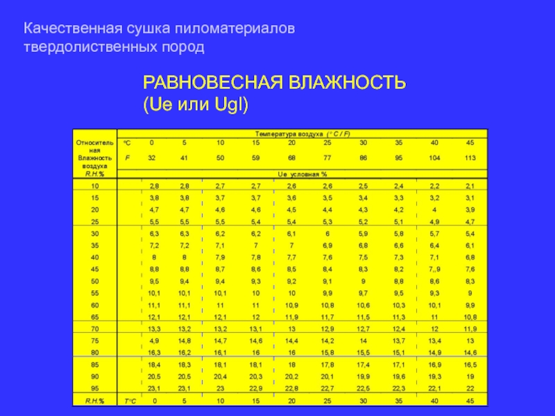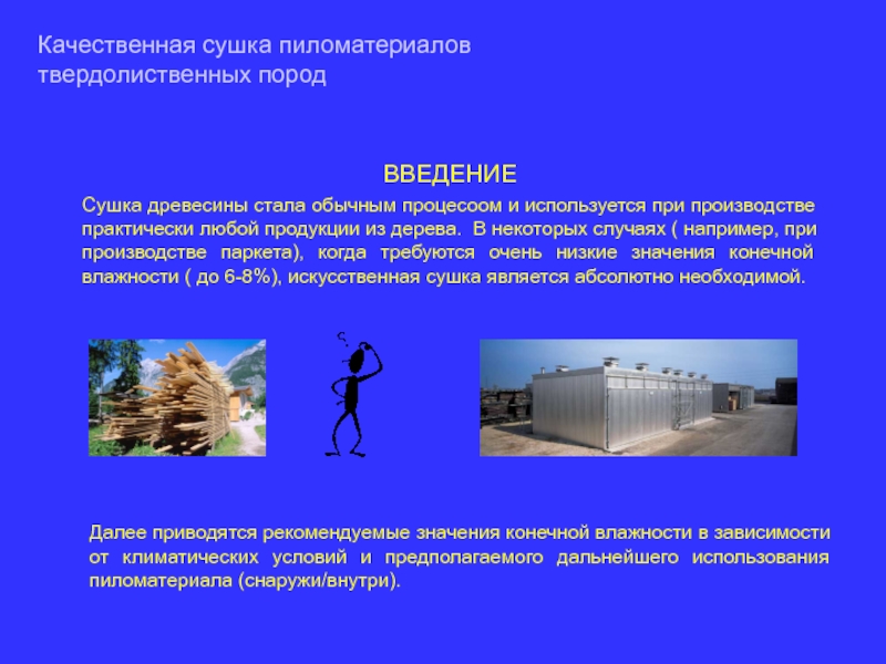 некоторых случаях ( например, при производстве паркета), когда требуются очень низкие значения конечной влажности ( до 6-8%), искусственная сушка является абсолютно необходимой.Далее приводятся рекомендуемые значения конечной влажности в зависимости от климатических условий и предполагаемого дальнейшего использования пиломатериала (снаружи/внутри).