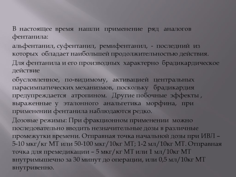 обусловленное, по-видимому, активацией центральных парасимпатических механизмов, поскольку брадикардия предупреждается атропином. Другие побочные эффекты , выраженные у эталонного анальгетика морфина, при применении фентанила наблюдаются редко.