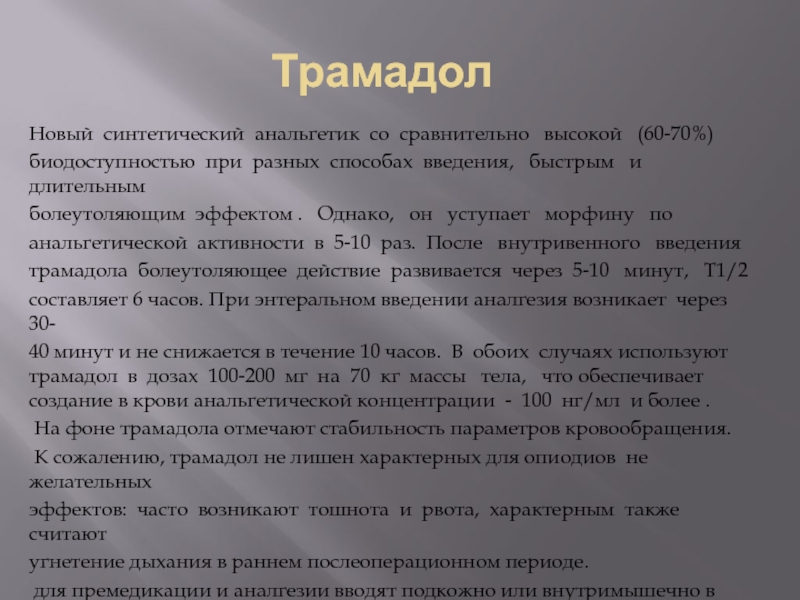 40 минут и не снижается в течение 10 часов. В обоих случаях используют трамадол в дозах 100-200 мг на 70 кг массы тела, что обеспечивает создание в крови анальгетической концентрации - 100 нг/мл и более .