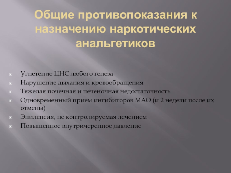 Слайд 19Общие противопоказания к назначению наркотических анальгетиков