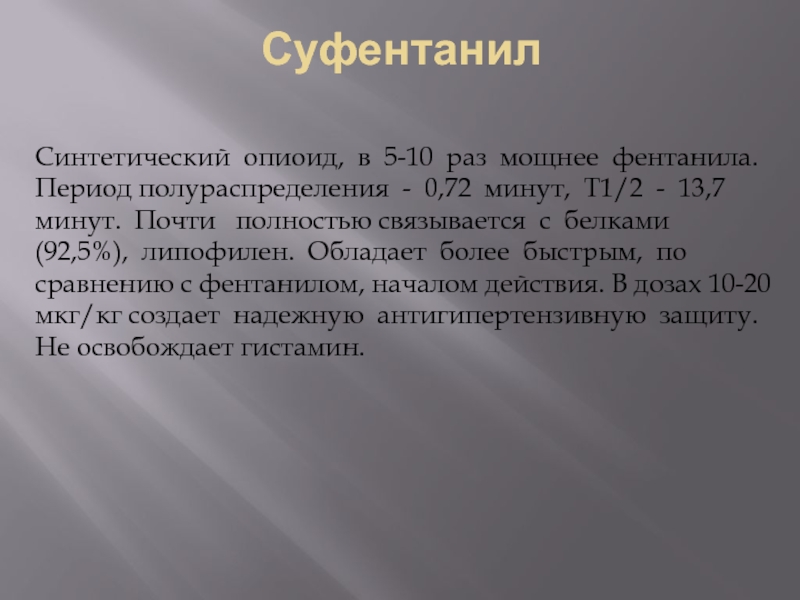 Синтетический опиоид, в 5-10 раз мощнее фентанила. Период полураспределения
