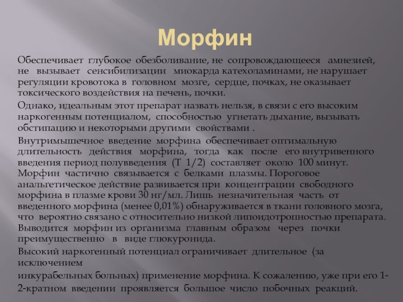 Однако, идеальным этот препарат назвать нельзя, в связи с его высоким наркогенным потенциалом, способностью угнетать дыхание, вызывать обстипацию и некоторыми другими свойствами .