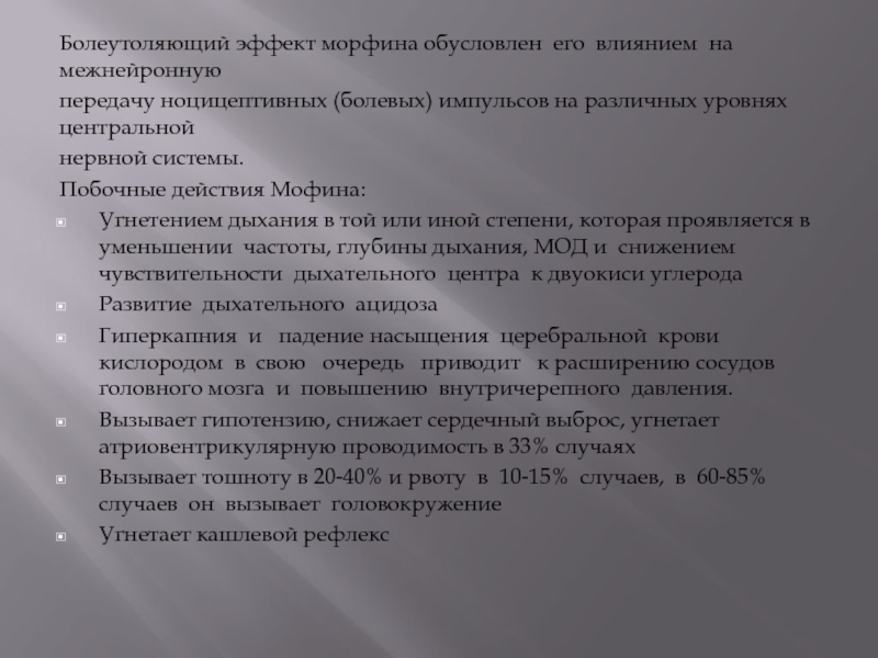 Слайд 8Болеутоляющий эффект морфина обусловлен его влиянием на межнейронную