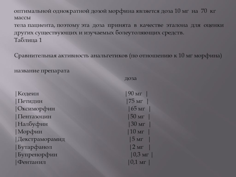 Слайд 7оптимальной однократной дозой морфина является доза 10 мг на 70
