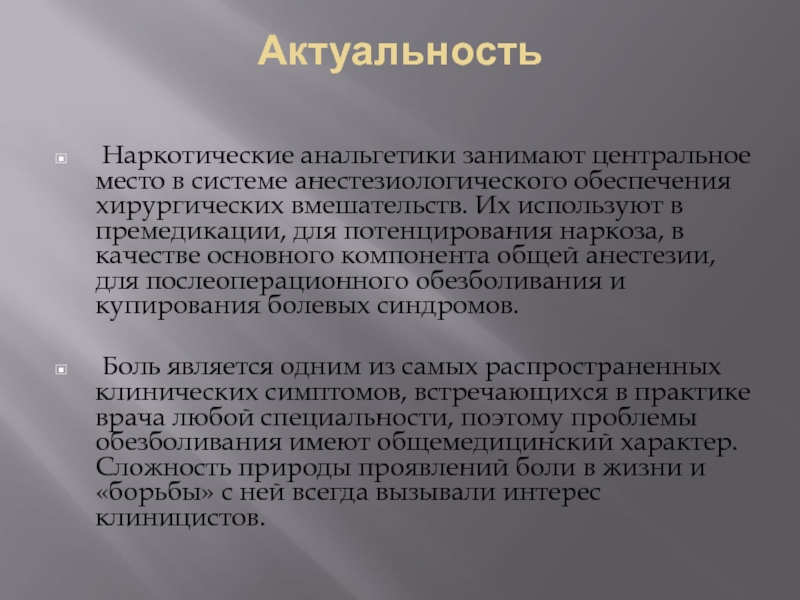 Боль является одним из самых распространенных клинических симптомов, встречающихся в практике врача любой специальности, поэтому проблемы обезболивания имеют общемедицинский характер. Сложность природы проявлений боли в жизни и «борьбы» с ней всегда вызывали интерес клиницистов.