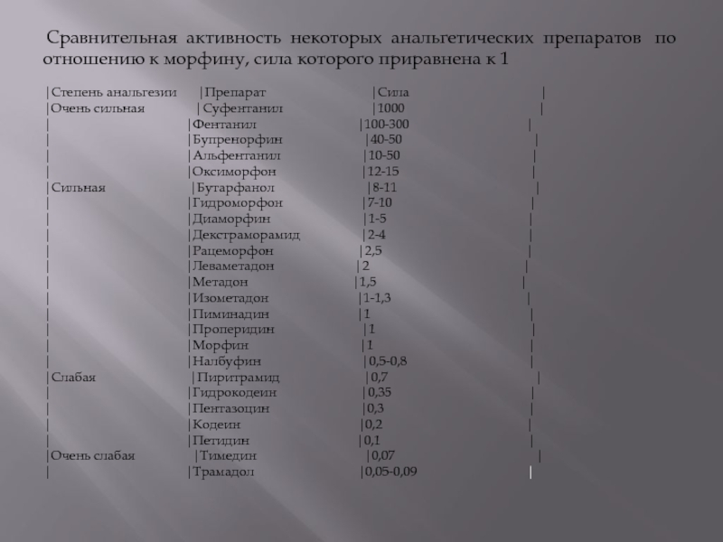 Слайд 9 Сравнительная активность некоторых анальгетических препаратов по