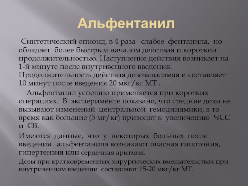 Альфентанил успешно применяется при коротких операциях. В эксперименте показано, что средние дозы не вызывают изменений центральной гемодинамики, в то время как большие (5 мг/кг) приводят к увеличению ЧСС и СВ.