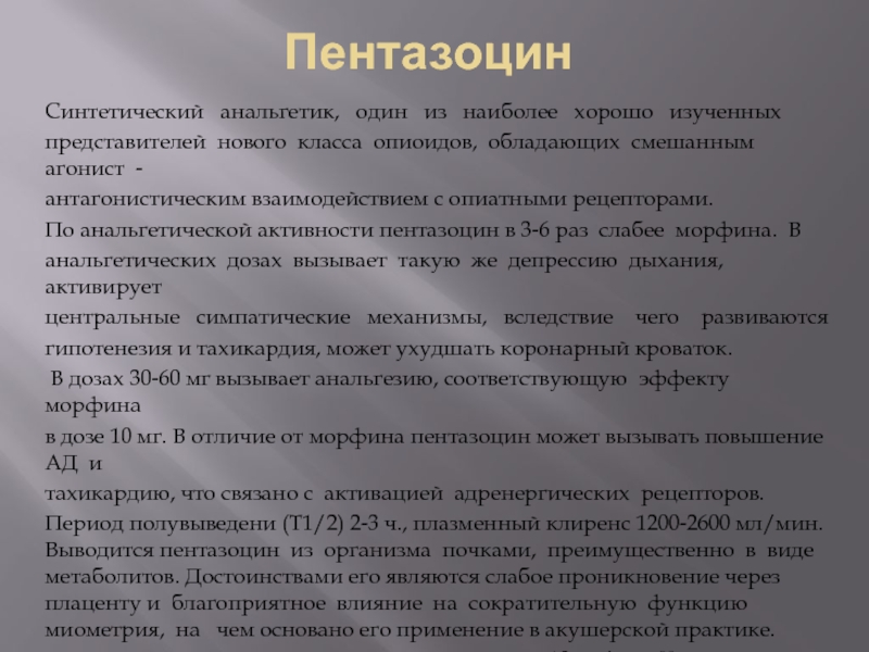 в дозе 10 мг. В отличие от морфина пентазоцин может вызывать повышение АД и