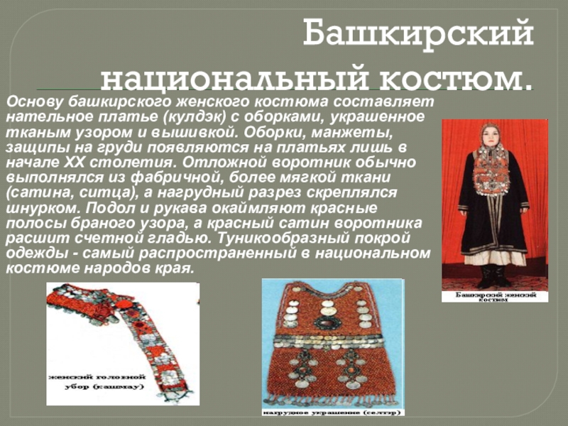 Основу башкирского женского костюма составляет нательное платье (кулдэк)
