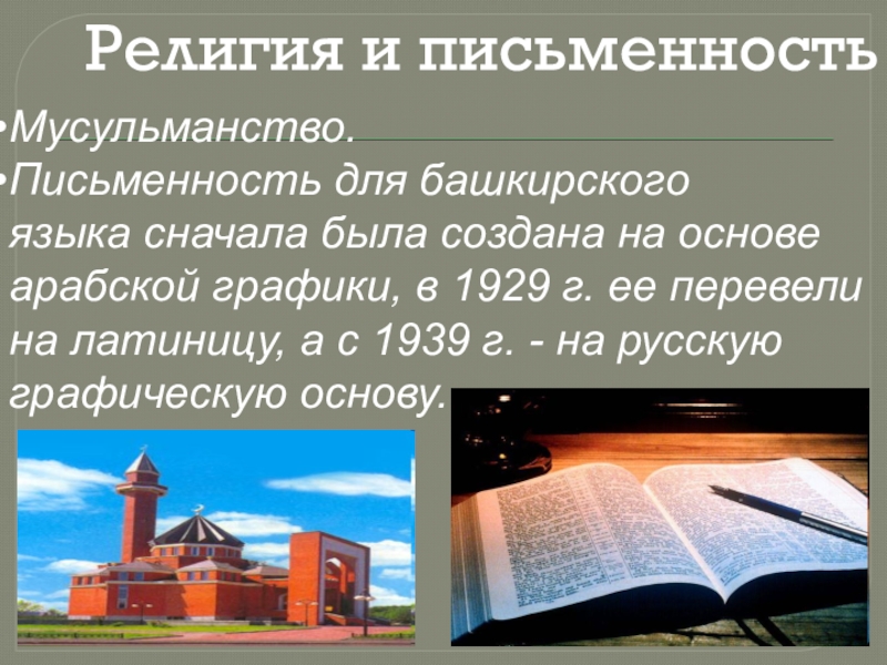 Религия и письменность Мусульманство. Письменность для башкирского языка сначала была создана на основе арабской графики, в 1929
