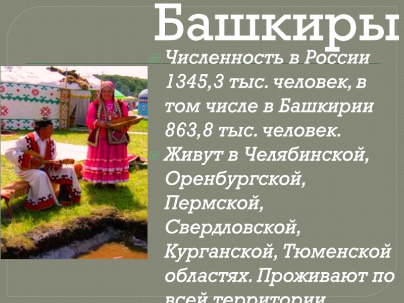 Башкиры       Численность в России 1345,3 тыс. человек, в том числе в Башкирии 863,8 тыс. человек.Живут в Челябинской, Оренбургской,
