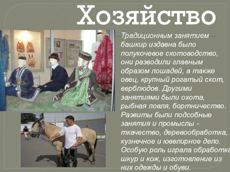 Хозяйство Традиционным занятием башкир издавна было полукочевое скотоводство, они разводили главным образом лошадей, а также овец, крупный