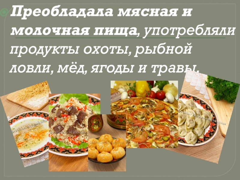 Слайд 9Преобладала мясная и молочная пища, употребляли продукты охоты, рыбной ловли,