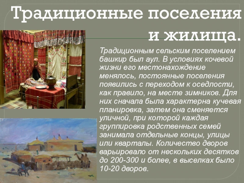 Традиционные поселения и жилища.Традиционным сельским поселением башкир был аул. В условиях кочевой жизни его местонахождение менялось, постоянные