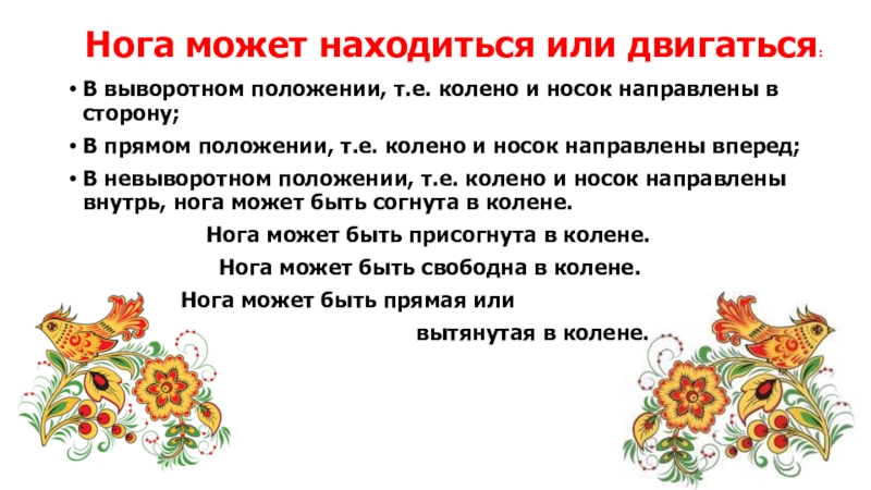 Нога может находиться или двигаться:В выворотном положении, т.е. колено и носок направлены в сторону;В прямом положении, т.е.