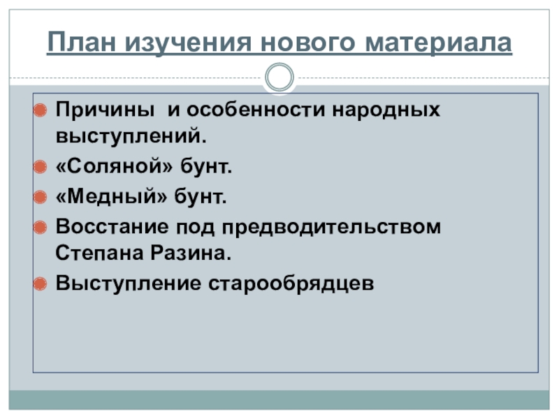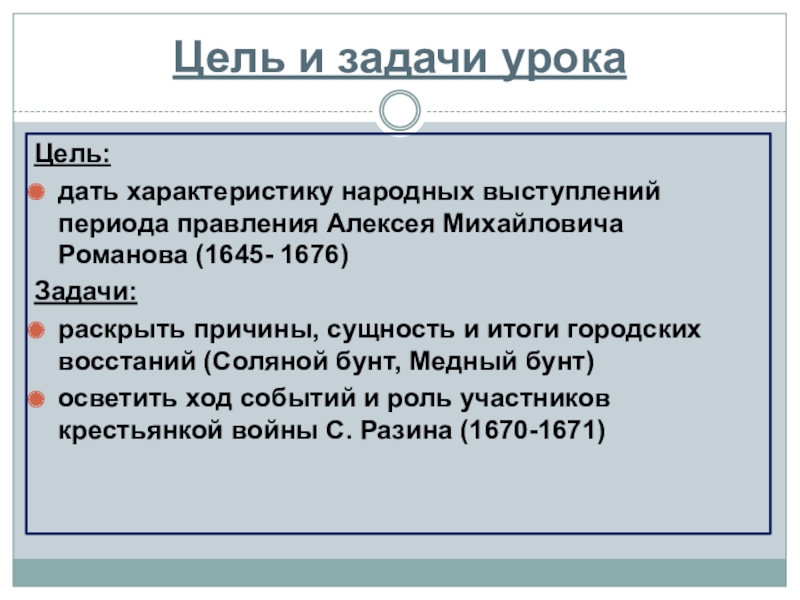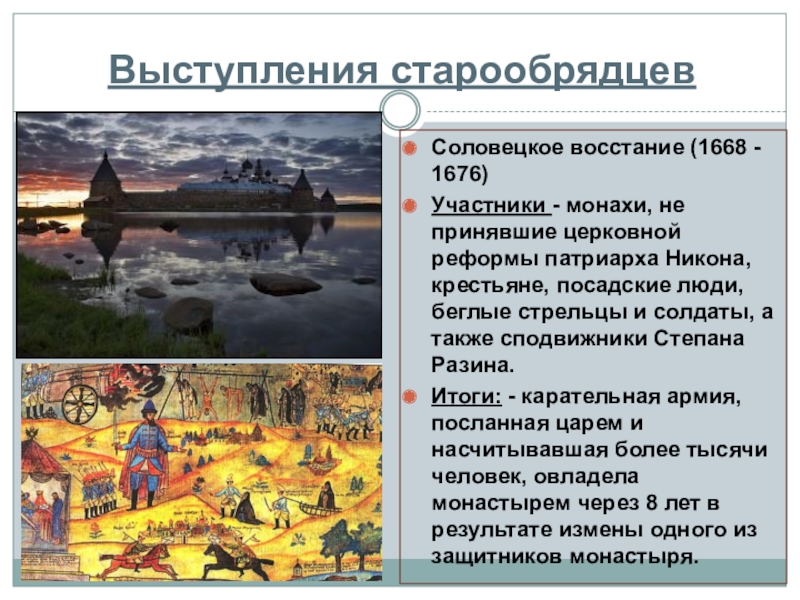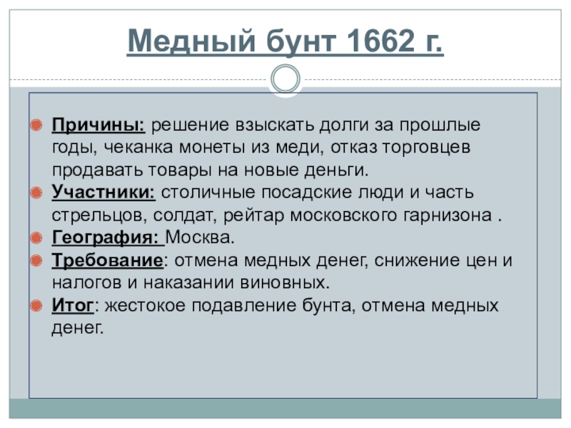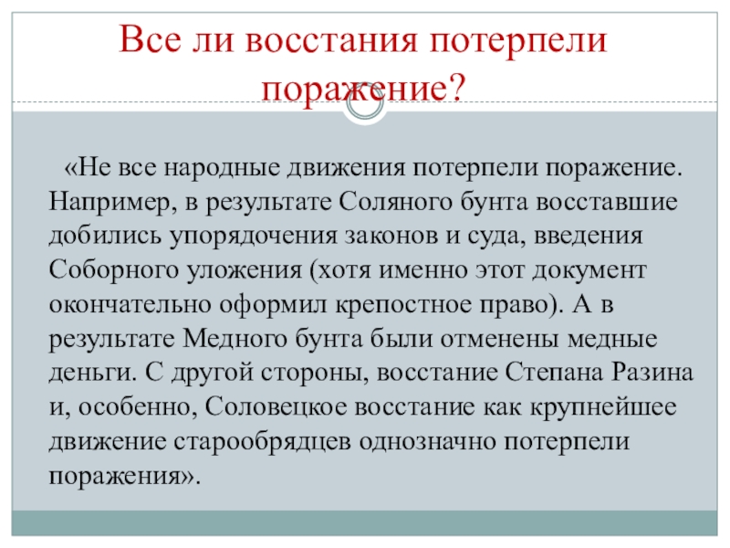 суда, введения Соборного уложения (хотя именно этот документ окончательно оформил крепостное право). А в результате Медного бунта были отменены медные деньги. С другой стороны, восстание Степана Разина и, особенно, Соловецкое восстание как крупнейшее движение старообрядцев однозначно потерпели поражения».