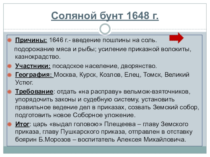 Например, в результате Соляного бунта восставшие добились упорядочения законов и