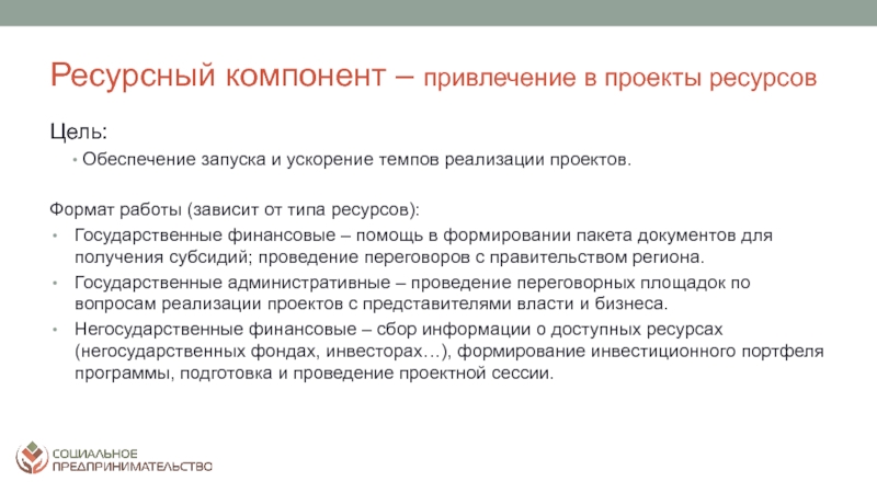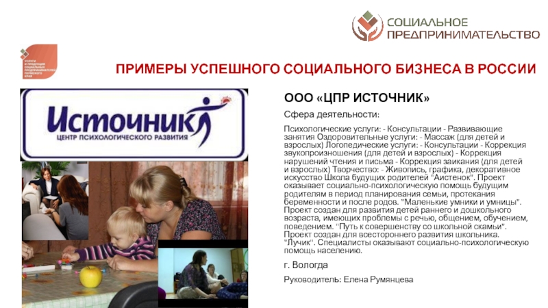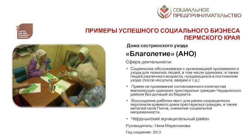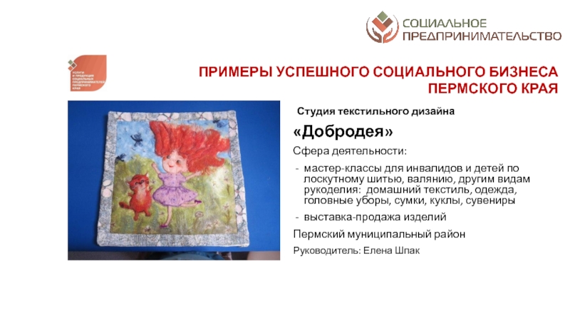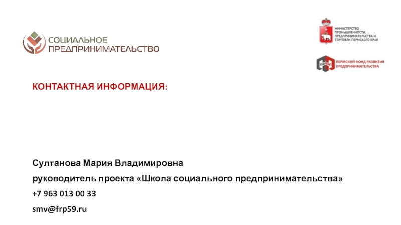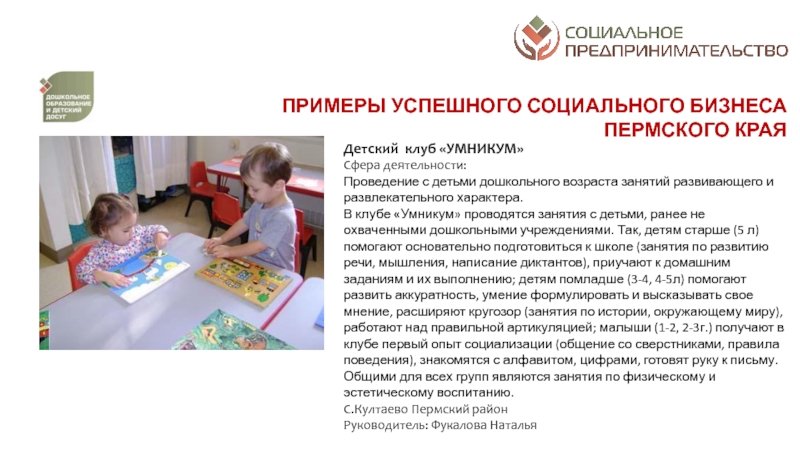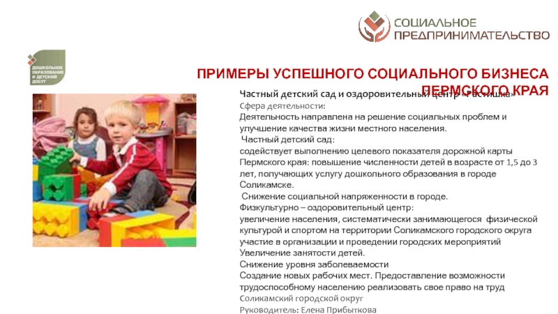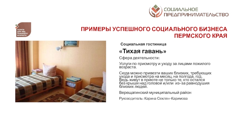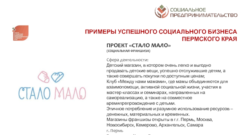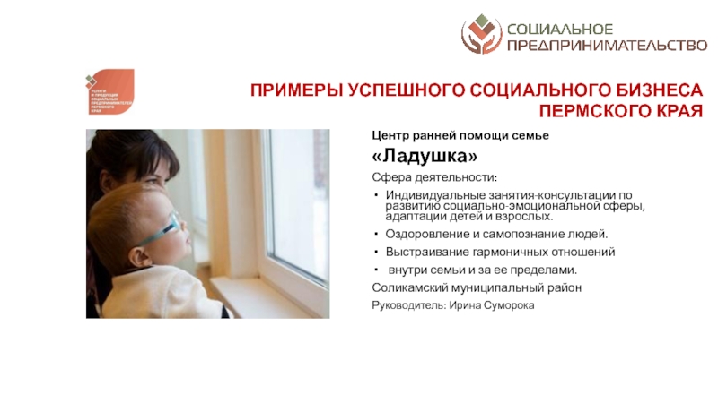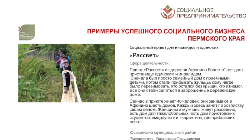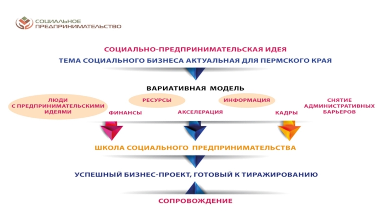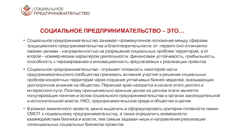 разрешение социальных проблем территорий; а от второй – коммерческим характером деятельности: финансовая устойчивость, прибыльность, способность к тиражированию и инновационность предлагаемых к реализации проектовСоциальное предпринимательство - отражает готовность некоторой части предпринимательского сообщества принимать активное участие в решении социальных проблем конкретных территорий через создание устойчивых бизнес-моделей, оказывающих долгосрочное влияние на общество. Пермский край находится в начале этого долгого и интересного пути. Поэтому принципиально важным делом на данном этапе является популяризация понятия и основ социального предпринимательства в органах законодательной и исполнительной власти, НКО, предпринимательской среде и обществе в целом