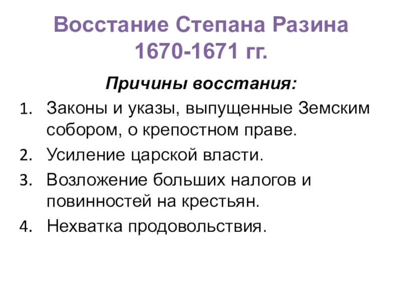Восстание Степана Разина 1670-1671 гг.Причины восстания: Законы и указы, выпущенные Земским собором, о крепостном праве.Усиление царской власти.Возложение