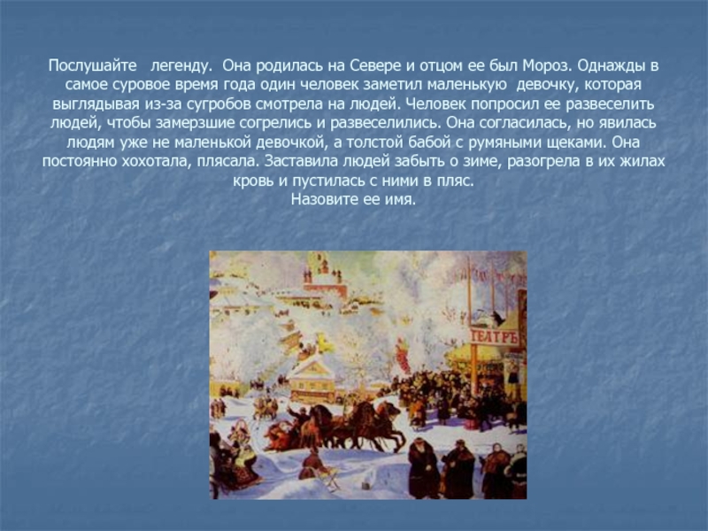 заметил маленькую девочку, которая выглядывая из-за сугробов смотрела на людей. Человек попросил ее развеселить людей, чтобы замерзшие согрелись и развеселились. Она согласилась, но явилась людям уже не маленькой девочкой, а толстой бабой с румяными щеками. Она постоянно хохотала, плясала. Заставила людей забыть о зиме, разогрела в их жилах кровь и пустилась с ними в пляс.
