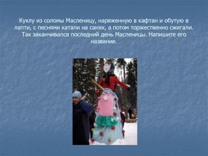 Слайд 8Куклу из соломы Масленицу, наряженную в кафтан и обутую в
