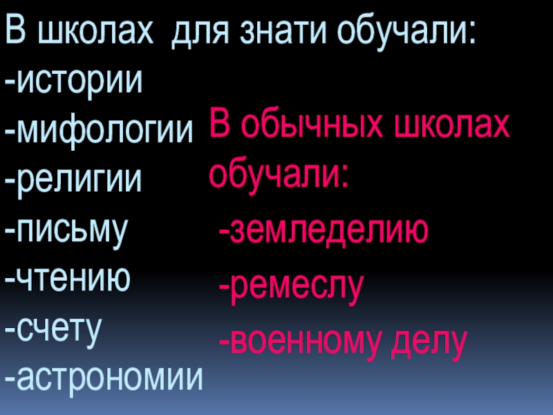 В школах для знати обучали: -истории -мифологии -религии -письму -чтению  -счету -астрономии  В обычных школах