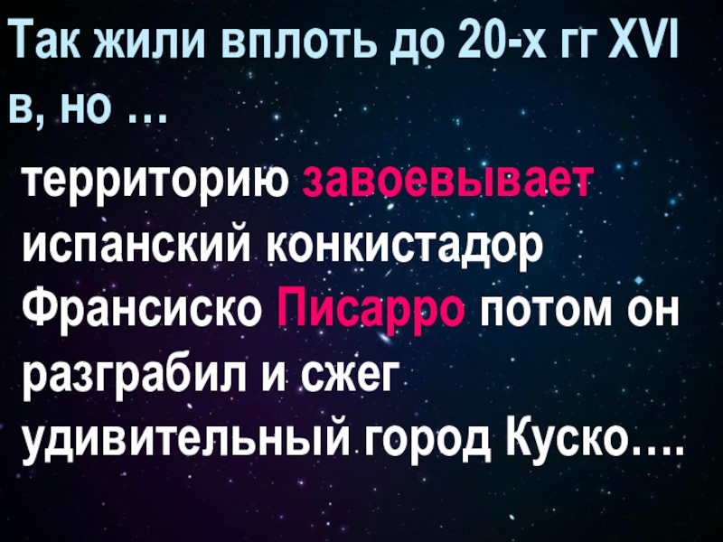 Так жили вплоть до 20-х гг XVI в, но … территорию завоевывает испанский конкистадор Франсиско Писарро потом