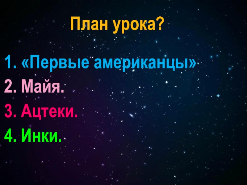 1. «Первые американцы»2. Майя.3. Ацтеки.4. Инки.План урока?