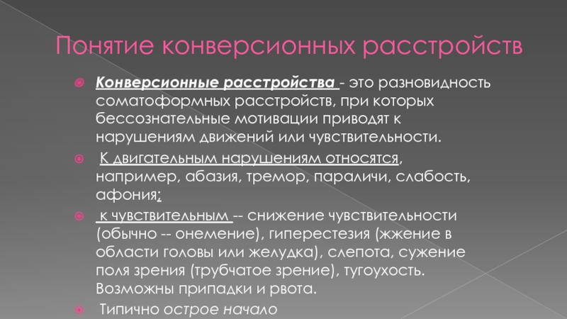 Под конверсией понимается символическое выражение психологического конфликта через различные соматические симптомы, то есть физический недуг рассматривается как способ избавления от тревоги и стресса («бегство в болезнь»).