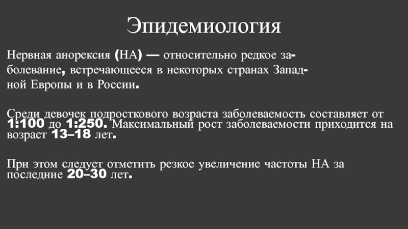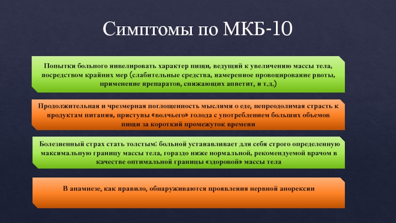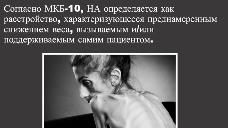 Слайд 4Согласно МКБ-10, НА определяется как расстройство, характеризующееся преднамеренным снижением веса,